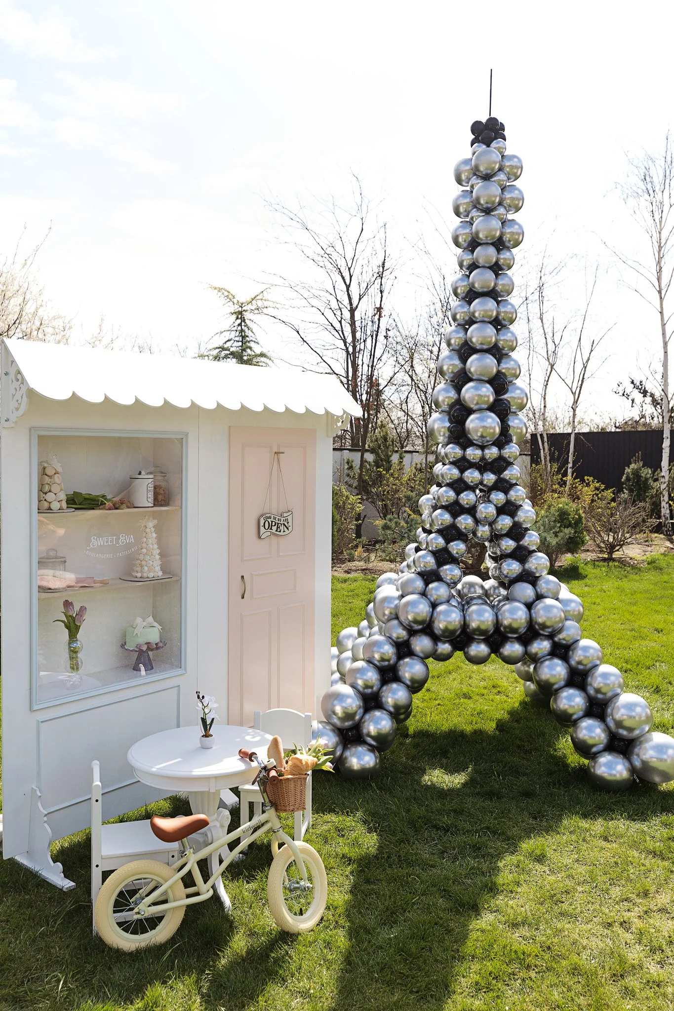 Piesa centrală a acestui decor este backdrop-ul nostru custom: o cofetărie franțuzească autentică.