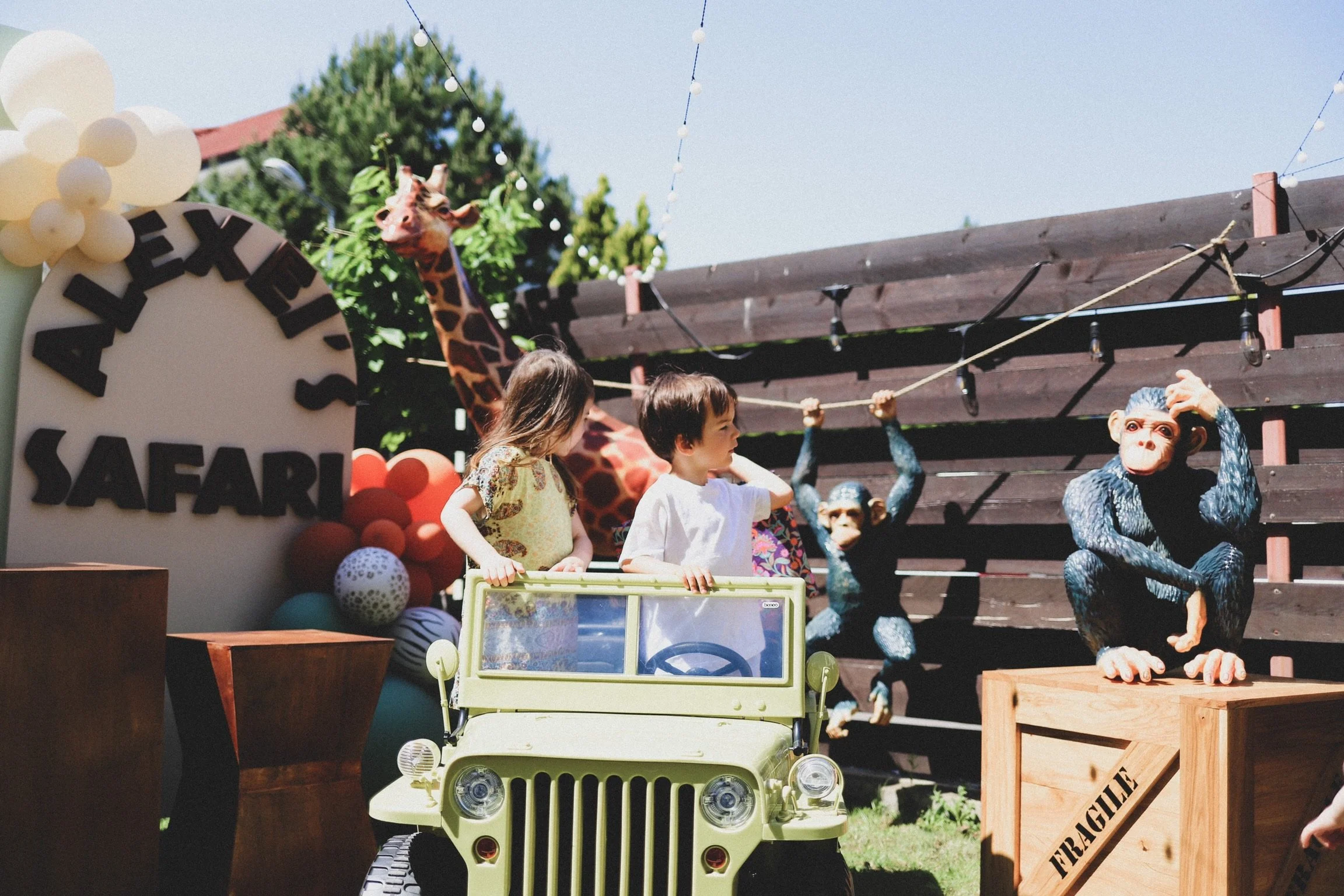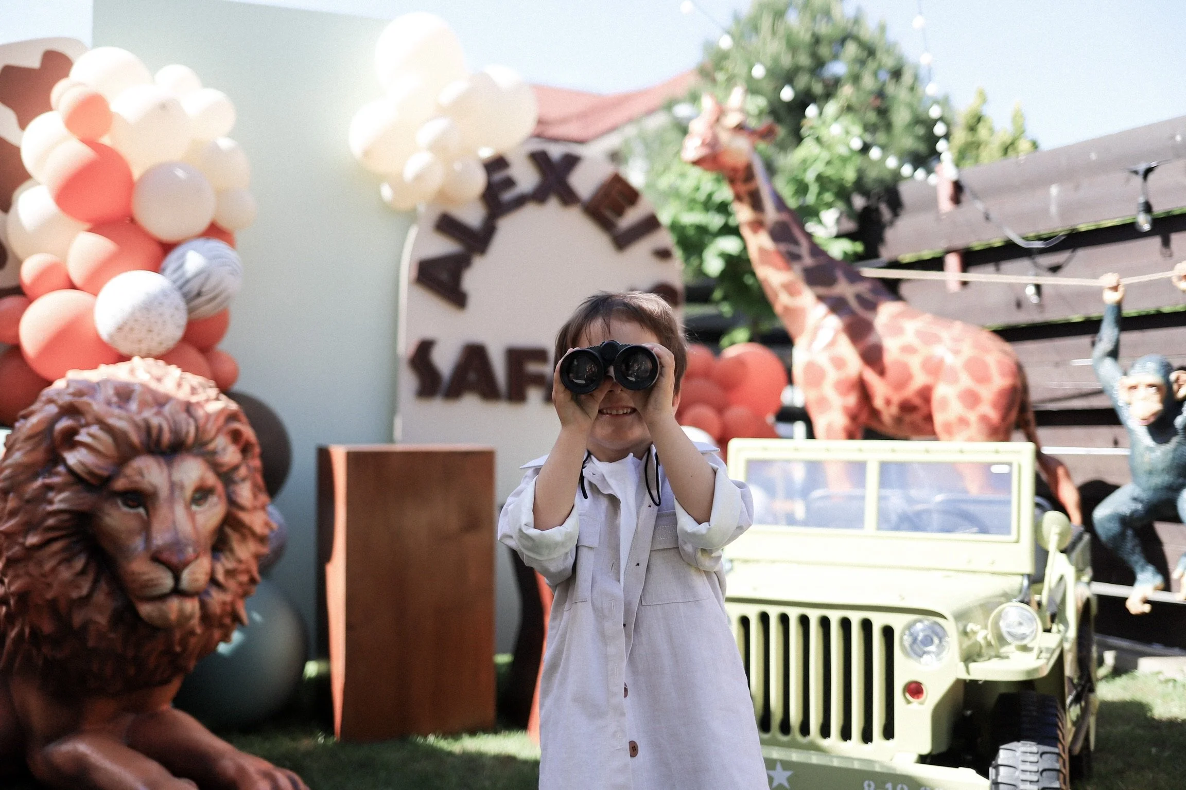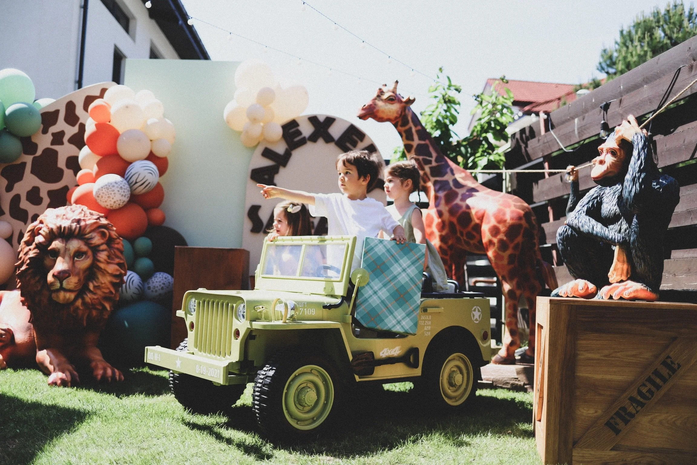 Cea mai dorita tematica de petrecere si mult indragita de micutii exploratori. Animale de dimensiuni mari, girafă, leu, elefant, maimuțe, toate menite să reproducă o călătorie de poveste în Safari. Mașinuță Jeep 4x4, gândită să aducă momente de distracție maximă în rândul celor mici, panouri foto decorative în printuri și culori ce întregesc tematica Safari, mobilier din lemn rustic, toate aceste elemente pentru o petrecere ”UAU!”, care aduc garantat bucurie și extaz invitaților.